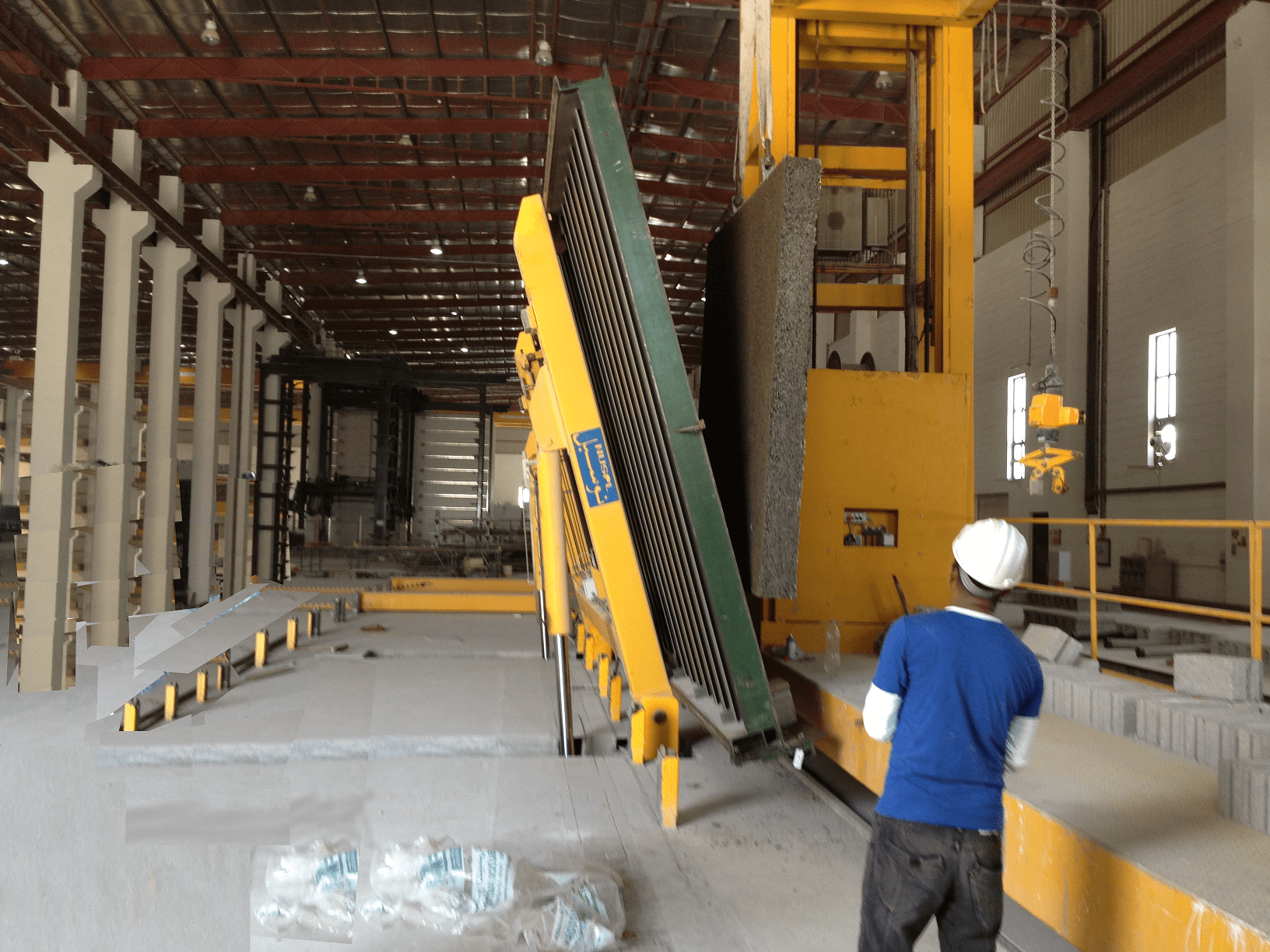 7. Finally, the panels are tilted to a vertical position, lifted and removed by an overhead crane to the temporary curing stockyards/storage facilities.